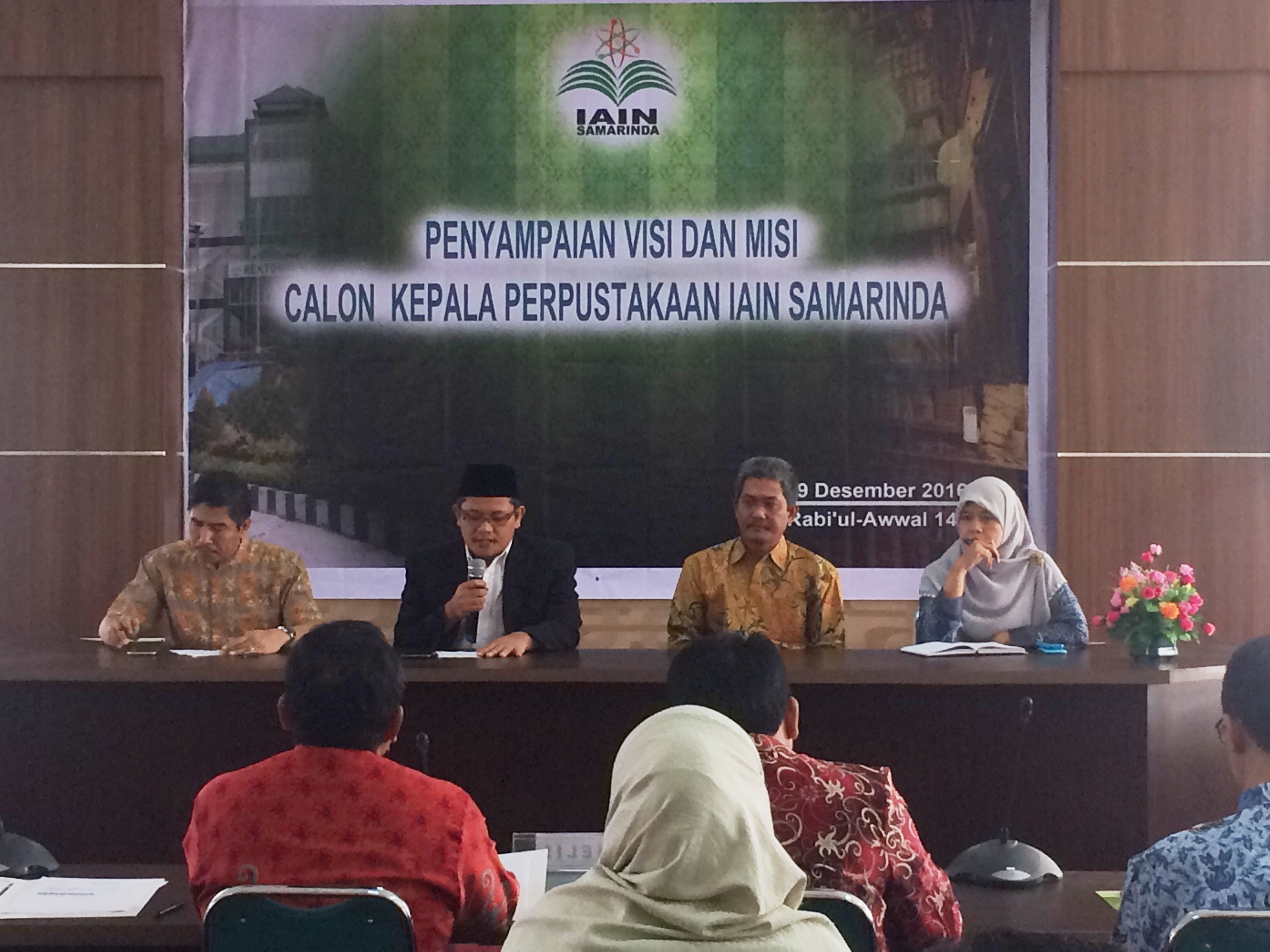 SAMARINDA, IAINNEWS,- Empat Calon Kepala Perpustakaan Institut Agama Islam Negeri (IAIN) Samarinda sampaikan visi dan misi terbaiknya dalam pengelolaan Perpustakaan Pusat dihadapan para Panelis, Senat dan para Pimpinan dilingkungan IAIN Samarinda pada Kamis, 29/12 bertempat di Auditorium Kampus 2 IAIN Samarinda Jalan HAM Rifadin Loajanan Ilir Kota Samarinda.