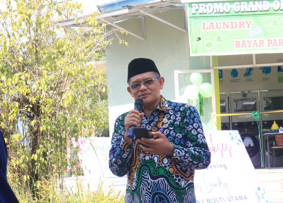 Pimpinan utama PT. JNJ Multi Utama, Jeni Prasetyo memberikan apresiasi kepada pelaksana yang terlibat dalam kegiatan peresmian dan grand opening Usaha Plus Laundry.