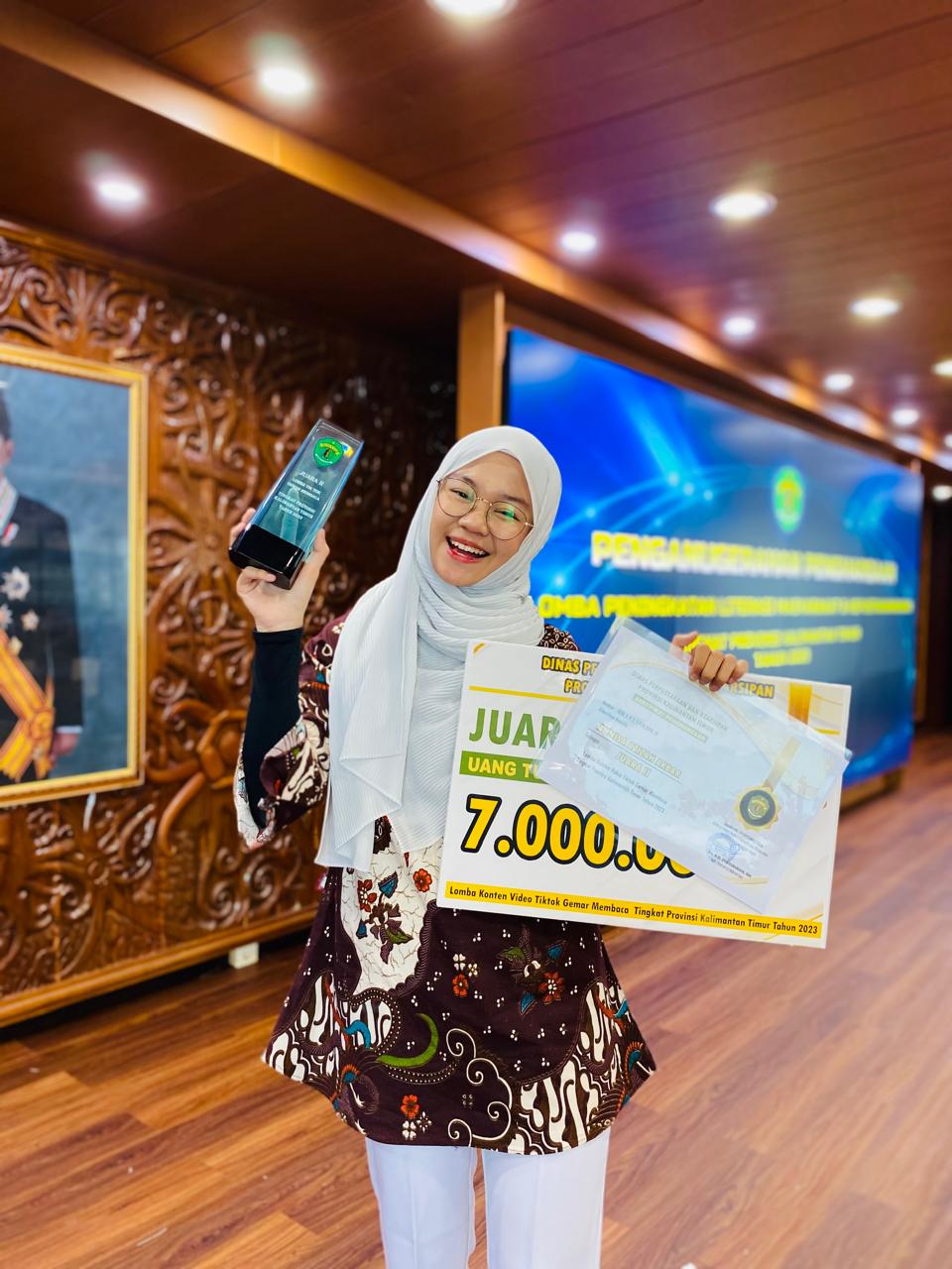 “Pada saat saya Mahasiswa Baru, saya juga ada memenangkan kompetisi pada 19 September 2023 yang diselenggarakan oleh Dinas Perpustakaan Kaltim, saya memenangkan kategori Juara 2 Lomba Tiktok Gemar Membaca, serta diapresiasi melakukan wisata literasi pada tanggal 20-23 September 2023 Jakarta, Sukabumi, dan Bogor,” ucap Caca.