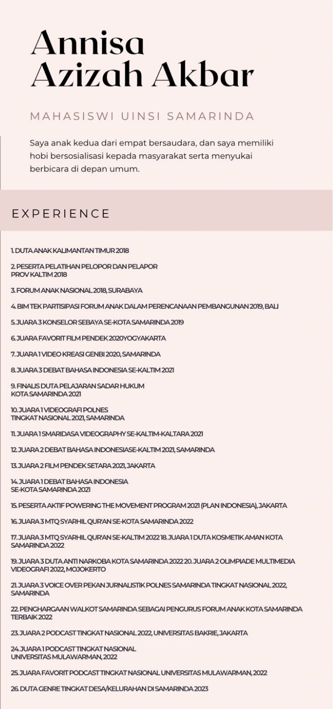 “Pada bulan Januari lalu, saya juga memenangkan kompetisi short video pak yang diselenggarakan boleh alumni Beasiswa Kaltim Tuntas dengan tema Kontribusi Generasi Muda dalam Membangun Kalimantan Timur. Se-Kalimantan Timur alhamdulillah saya juara 2,” sambungnya.