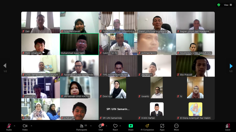 SAMARINDA, UINSI NEWS,- Satuan Pengawas Intern (SPI) UIN Sultan Aji Muhammad Idris Samarinda inisiasi Bimbingan Teknis Review Evidence SPIP dengan menghadirkan Dr. Shaleh, S.Ag., M.Pd., Sekretaris SPI UIN Suka Yogyakarta yang pernah menjabat sebagai Auditor Itjen Kemenag RI, sebagai narasumber melalui zoom meeting, Senin (25/11).