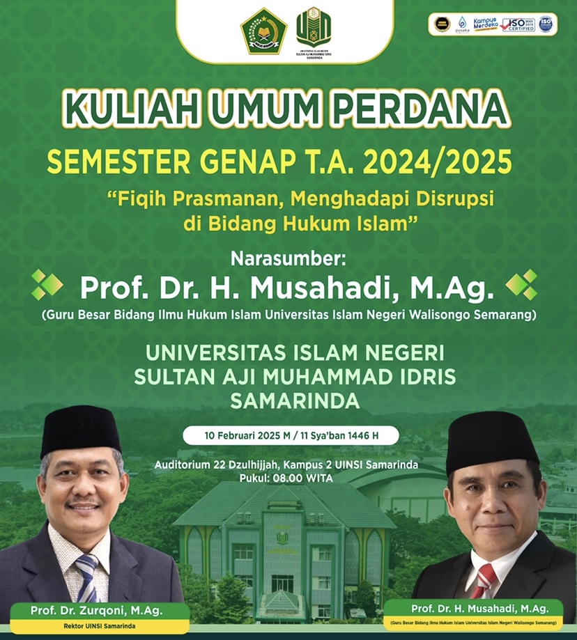 SAMARINDA, UINSI NEWS,- UIN Sultan Aji Muhammad Idris (UINSI) Samarinda menggelar kuliah umum perdana Semester Genap Tahun Akdemik 2024/2025 dengan tema “Fikih Prasmanan, Menghadapi Disrupsi di Bidang Hukum Islam” di Auditorium 22 Dzulhijjah Kampus 2 UINSI. Senin (10/2).