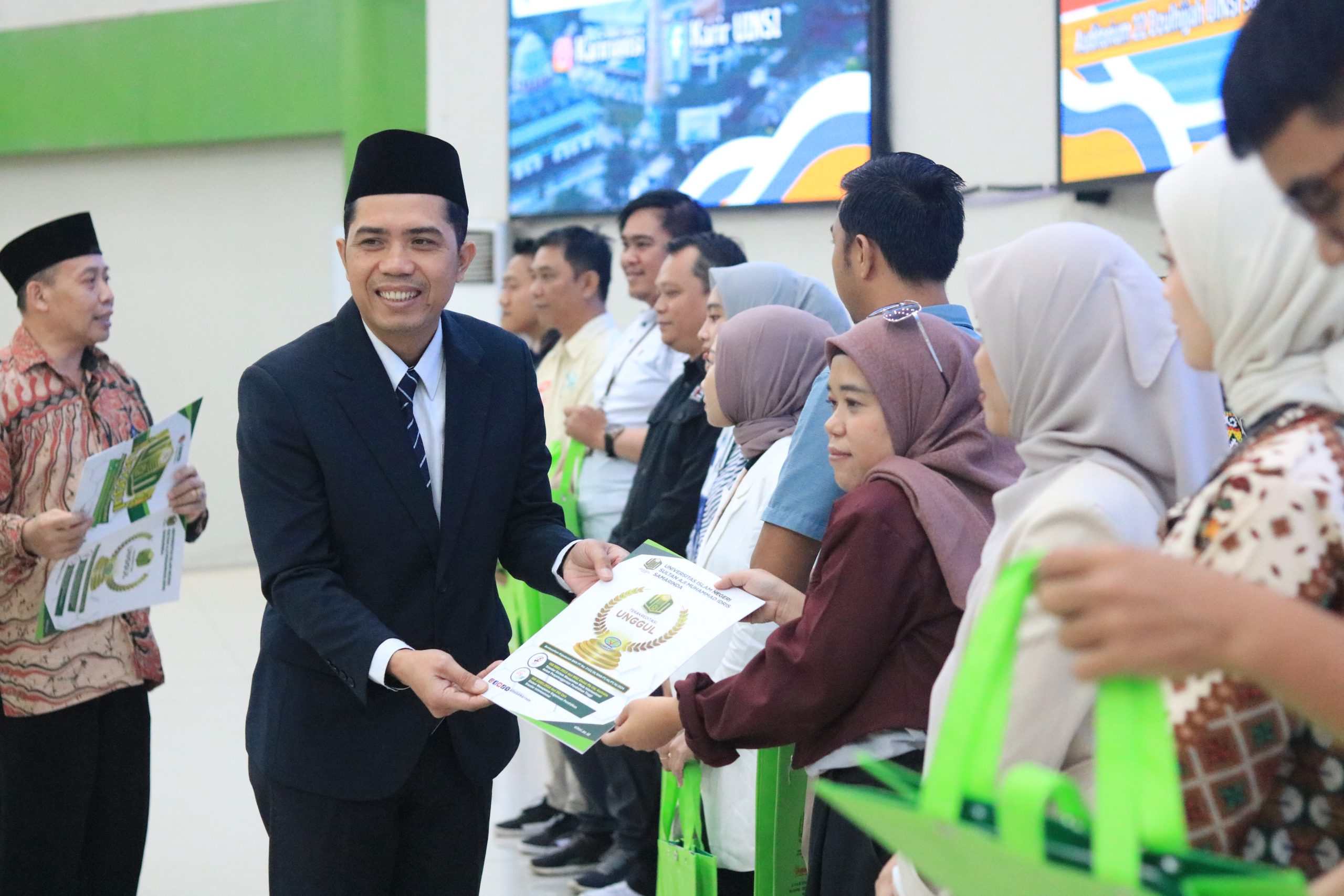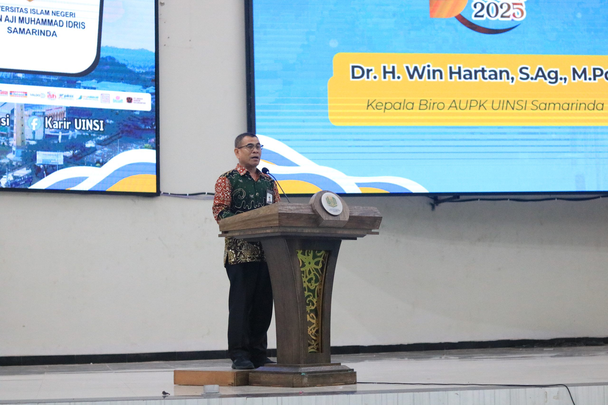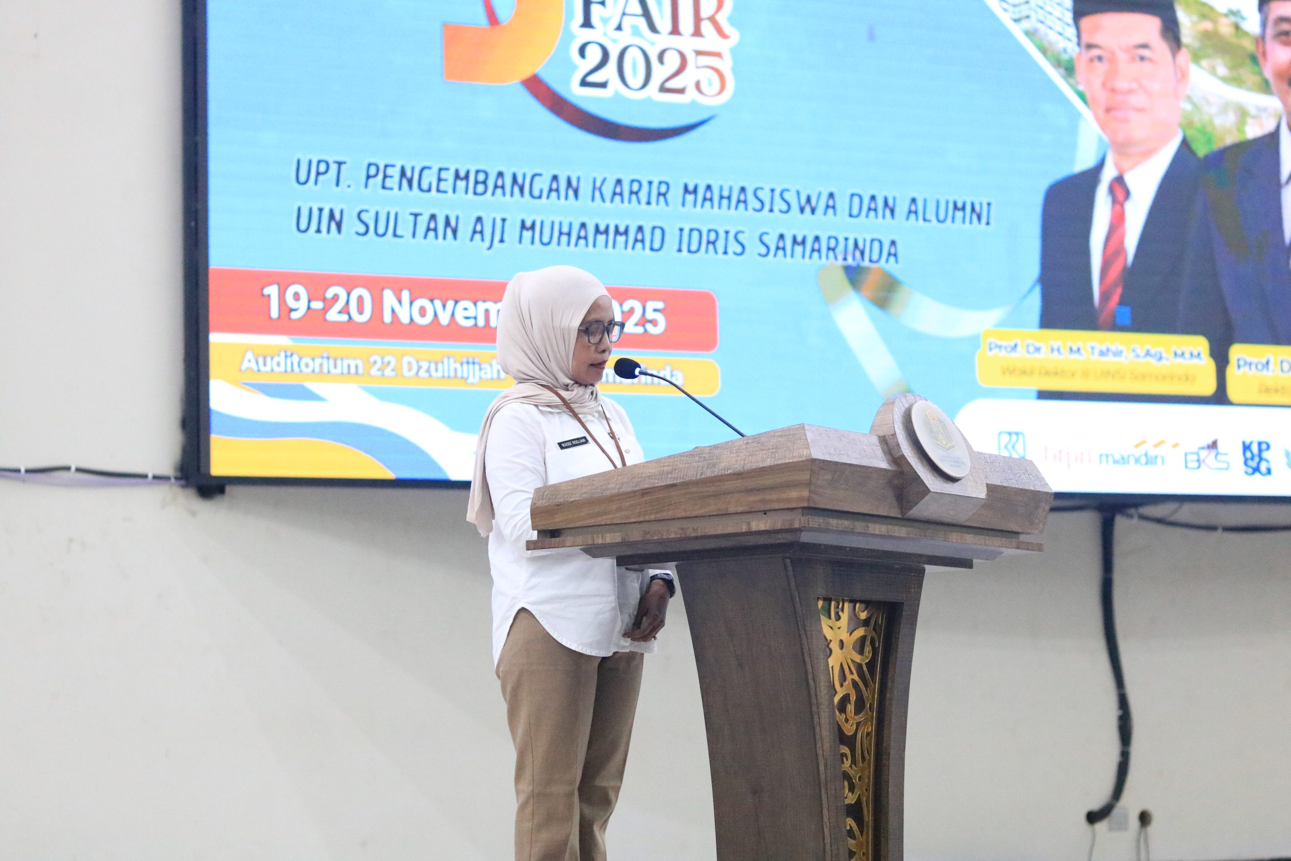 Acara kemudian dilanjutkan dengan sambutan sekaligus pembukaan resmi oleh Kepala Biro Administrasi Umum, Perencanaan, dan Keuangan (AUPK) UINSI Samarinda, Dr. H. Win Hartan, S.Ag., M.Pd.I., yang hadir mewakili Rektor. Dalam sambutannya, beliau menyampaikan apresiasi atas konsistensi dan dedikasi UPT. PKMA dalam menyelenggarakan Job Fair setiap tahun. Ia berharap kegiatan ini menjadi amal jariyah sekaligus sarana kebermanfaatan bagi para lulusan UINSI yang jumlahnya terus meningkat setiap tahunnya dan membutuhkan informasi serta kesempatan kerja seluas-luasnya.