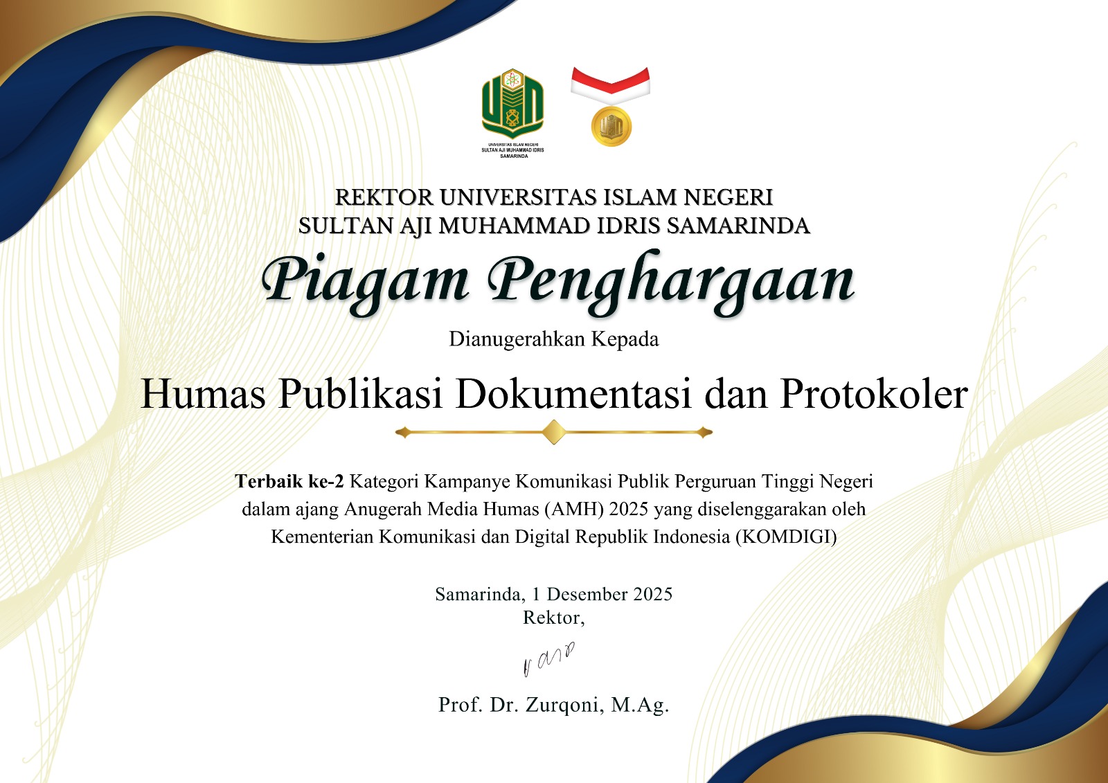 Piagam penghargaan diserahkan langsung oleh Rektor UINSI Samarinda, Prof. Dr. Zurqoni, M.Ag., sebagai bentuk apresiasi atas prestasi Tim Humas yang meraih Terbaik ke-2 Kategori Kampanye Komunikasi Publik Perguruan Tinggi Negeri dalam ajang Anugerah Media Humas (AMH) 2025 yang diselenggarakan oleh Kementerian Komunikasi dan Digital Republik Indonesia (KOMDIGI).