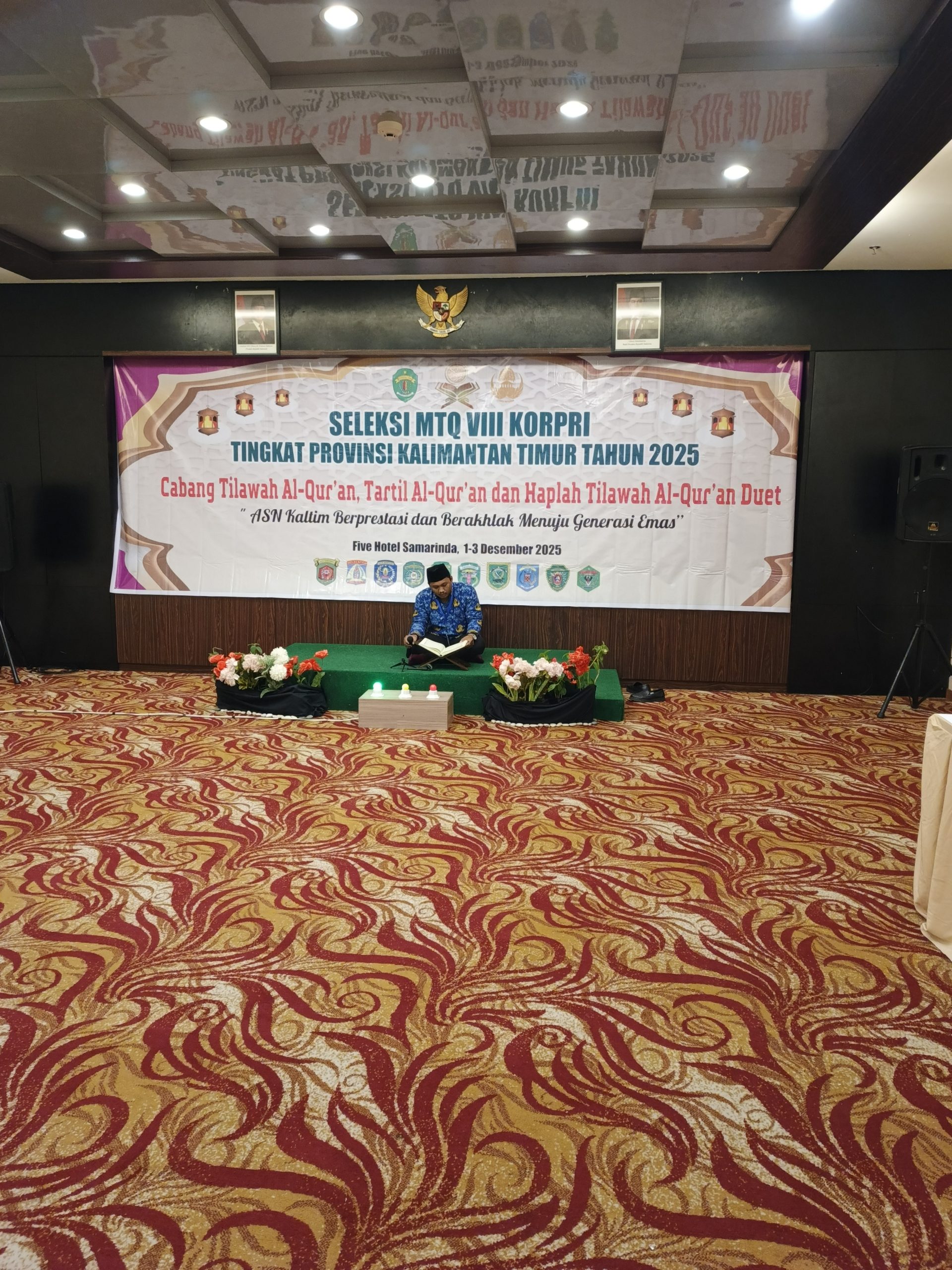 SAMARINDA, UINSI NEWS — UIN Sultan Aji Muhammad Idris (UINSI) Samarinda ikut serta dan konsisten dalam mendukung peningkatan kualitas sumber daya aparatur sipil negara (ASN) di lingkungan kampus dengan mengirimkan kafilah putra dan putri pada ajang Seleksi Musabaqah Tilawatil Qur’an (MTQ) VIII KORPRI Tingkat Provinsi Kalimantan Timur Tahun 2025. Kegiatan berlangsung di Hotel Five Samarinda Senin (1/12), diikuti oleh para ASN terbaik UINSI yang berkompetisi dalam berbagai cabang lomba Al-Qur’an.