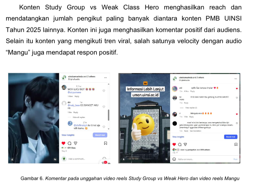 Ia menambahkan bahwa penghargaan tersebut menjadi bukti nyata komitmen UINSI dalam meningkatkan kualitas layanan dan inovasi dalam proses penerimaan mahasiswa baru, baik dalam layanan secara langsung maupun layanan digital melalui konten media sosial, podcast, dan siaran langsung.