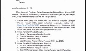 SAMARINDA, UINSI NEWS – Universitas Islam Negeri Sultan Aji Muhammad Idris (UINSI) Samarinda menyampaikan pengumuman pengusulan kenaikan pangkat/golongan Pegawai Negeri Sipil (PNS) untuk Periode Februari 2026 berdasarkan surat bernomor B-5529/Un.21/R/KP.01.02/12/2025 tanggal 15 Desember 2025. Mengacu pada Peraturan Badan Kepegawaian Negara Nomor 4 Tahun 2025 tanggal 1 September 2025 tentang Periodisasi Kenaikan Pangkat PNS, seluruh PNS […]