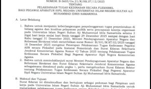 SAMARINDA, UINSI NEWS – Berdasarkan Surat Edaran Nomor B-5603/Un.21/R/HK.07/12/2025 dari Rektor UINSI Samarinda, pelaksanaan tugas kedinasan secara fleksibel bagi Pegawai Aparatur Sipil Negara (ASN) di UINSI Samarinda akan dilaksanakan pada periode 29 hingga 31 Desember 2025. Surat Edaran ini bertujuan untuk mendukung kelancaran pelayanan publik serta pencapaian kinerja organisasi, dengan tetap menjaga kesejahteraan pegawai. Dalam […]