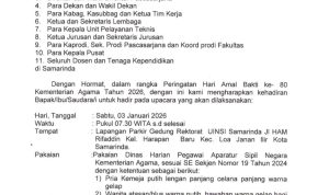 SAMARINDA, UINSI NEWS – Universitas Islam Negeri Sultan Aji Muhammad Idris (UINSI) Samarinda menerbitkan Surat Edaran/undangan pelaksanaan Upacara Peringatan Hari Amal Bakti (HAB) Kementerian Agama RI ke-80 Tahun 2026. Informasi tersebut tertuang dalam surat Nomor: B-5538/Un.21R/HM.08/12/2025 tertanggal 29 Desember 2025. Upacara akan dilaksanakan pada: Hari/Tanggal: Sabtu, 3 Januari 2026 Waktu: 07.30 WITA s.d. selesai Tempat: […]