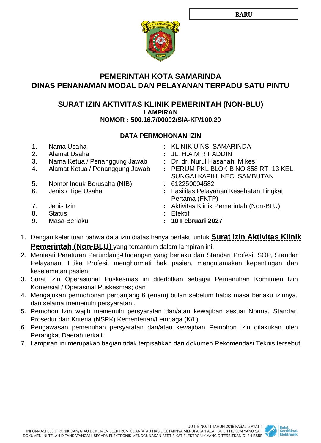 SAMARINDA, UINSI NEWS — Setelah melalui proses persiapan kurang lebih enam bulan, Klinik Universitas Islam Negeri Sultan Aji Muhammad Idris (UINSI) Samarinda akhirnya resmi mengantongi Surat Izin Aktivitas Klinik Pemerintah (Non-BLU) dari Pemerintah Kota Samarinda melalui Dinas Penanaman Modal dan Pelayanan Terpadu Satu Pintu (DPMPTSP). Izin tersebut terbit pada 10 Februari 2026 dan menjadi landasan hukum penyelenggaraan layanan kesehatan di lingkungan UINSI Samarinda, Rabu (11/2).
