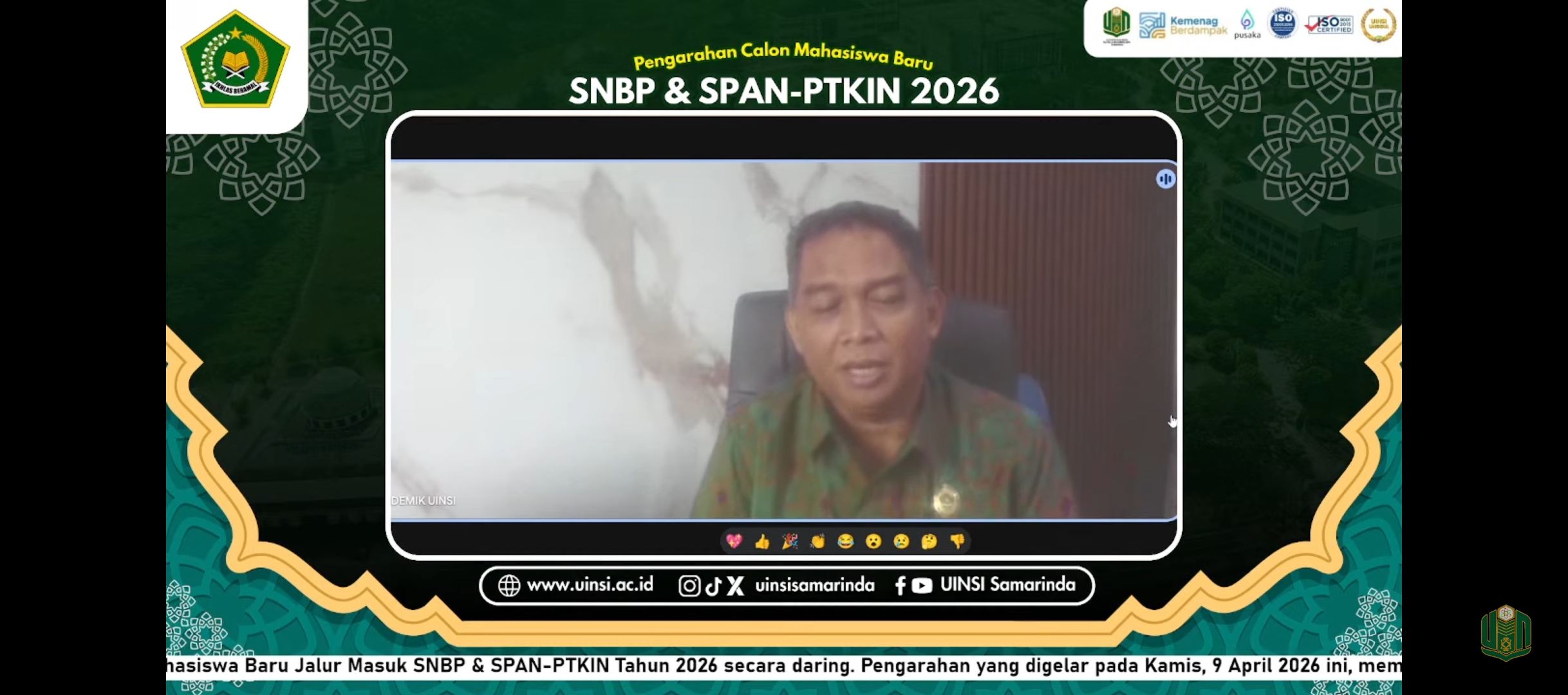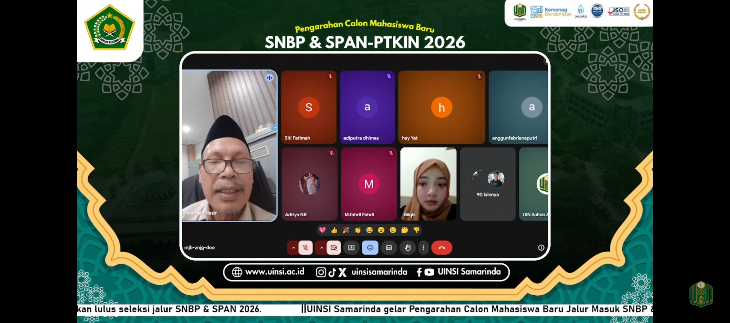 Beliau juga mengimbau kepada peserta yang tidak dapat mengikuti kegiatan secara langsung melalui Google Meet agar dapat mengakses tayangan ulang melalui kanal YouTube resmi UINSI Samarinda. Informasi terkini juga akan terus disampaikan melalui grup WhatsApp mahasiswa baru jalur SNBP dan SPAN-PTKIN yang telah difasilitasi oleh panitia, sebagai sarana koordinasi dan komunikasi guna meminimalisir terjadinya kesalahan informasi.