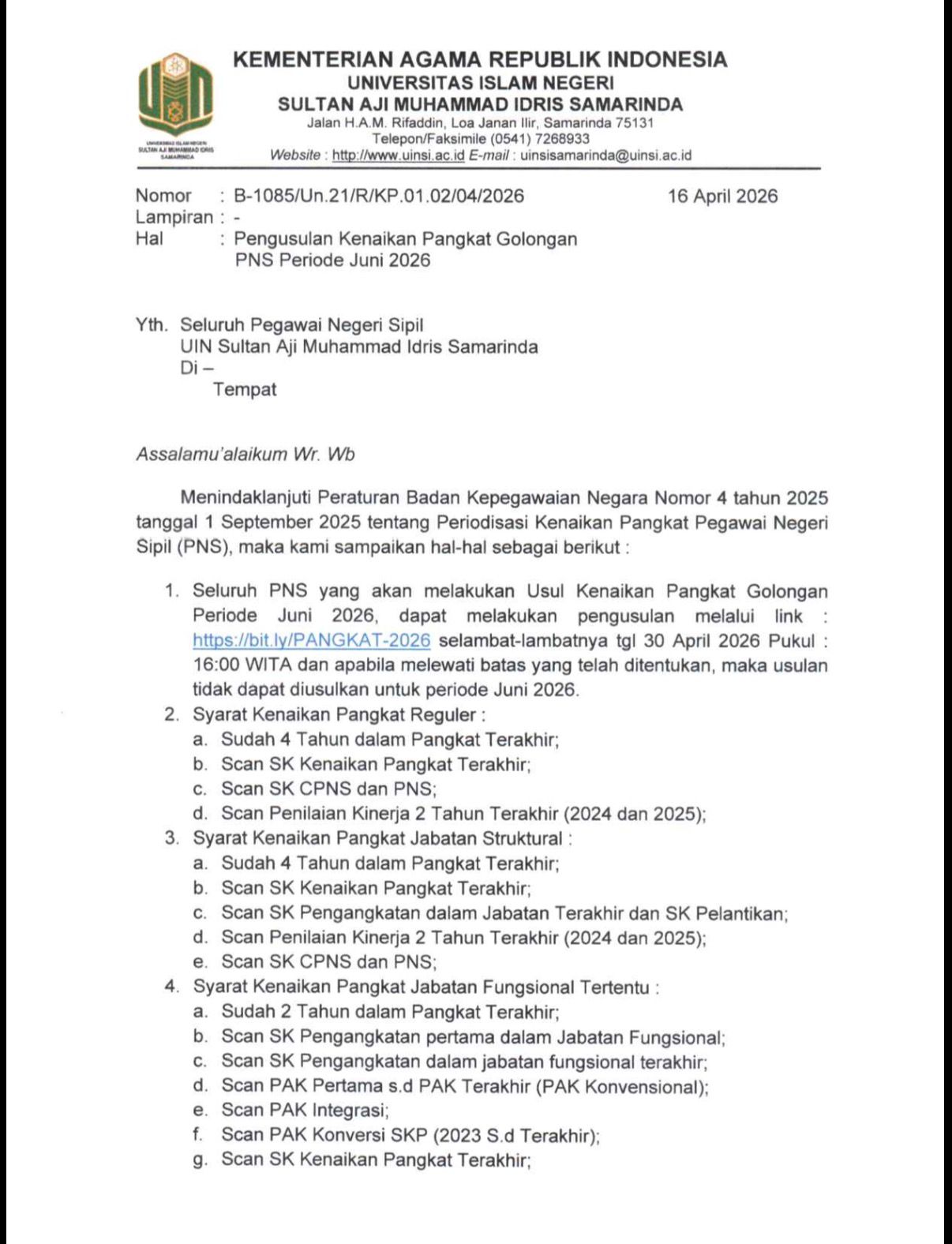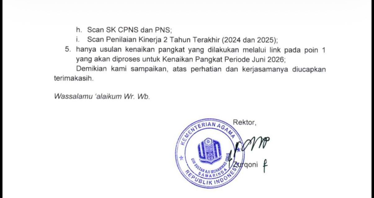 SAMARINDA, UINSI NEWS – Universitas Islam Negeri Sultan Aji Muhammad Idris (UINSI) Samarinda menyampaikan pengumuman pengusulan kenaikan pangkat/golongan Pegawai Negeri Sipil (PNS) untuk Periode Juni 2026 berdasarkan surat bernomor B-1085/Un.21/R/KP.01.02/04/2026 tanggal 16 April 2026.