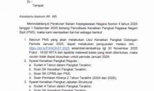 SAMARINDA, UINSI NEWS,- Universitas Islam Negeri Sultan Aji Muhammad Idris (UINSI) Samarinda membuka proses pengusulan kenaikan pangkat golongan Pegawai Negeri Sipil (PNS) untuk periode Januari 2026. Informasi ini disampaikan melalui surat bernomor B-5050/Un.21/R/KP.01.02/11/2025 tertanggal 24 November 2025. Mengacu pada Peraturan Badan Kepegawaian Negara Nomor 4 Tahun 2025 tanggal 1 September 2025 tentang Periodisasi Kenaikan Pangkat […]